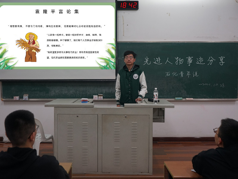 分享會上,許涵僑簡要介紹“石化青年說”的基本內(nèi)涵后,主講人湯越詳細地講述袁隆平同志的生平和貢獻,著重分享袁隆平先生的精彩言論集,并以此呼吁廣大青年傳承袁隆平先生的偉人精神。