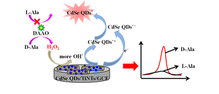氨基酸(AA)是生物體內(nèi)最重要的分子之一,絕大多數(shù)AA具有對映異構(gòu)體,不同的AA對映體往往表現(xiàn)出不同的生理特性,一種AA對映體可能對疾病治療有益,而另一種對映體可能毫無用處甚至具有副作用。因此對AA對映體進(jìn)行手性識(shí)別具有重要的研究意義。在本工作中,課題組制備了3-巰基丙酸功能化的硒化鎘量子點(diǎn)(MPA-CdSe QDs),使其與氨基化的TiO2納米管(NH2-TiNTs)發(fā)生酰胺化反應(yīng)。由于CdSe QDs與TiNTs之間的協(xié)同效應(yīng),得到的CdSe QDs/TiNTs獲得了增強(qiáng)的ECL性能。利用D-氨基酸氧化酶(DAAO)可選擇性地催化D-AA產(chǎn)生H2O2,采用電化學(xué)發(fā)光法實(shí)現(xiàn)該傳感體系在存在DAAO的條件下對多種AA對映體的手性識(shí)別。結(jié)果表明,該手性傳感體系具有較好的對映選擇性、穩(wěn)定性、重現(xiàn)性和普適性。此外,選取D-丙氨酸(D-Ala)作為檢測對象,該傳感體系對D-Ala具有較好的響應(yīng)行為,這表明該手性傳感器不僅可用于AA對映體的手性識(shí)別,還可實(shí)現(xiàn)對D-AA的高靈敏檢測。該成果于近日發(fā)表于分析化學(xué)領(lǐng)域國際著名期刊Analytical Chemistry (doi: 10.1021/acs.analchem.2c01383)。