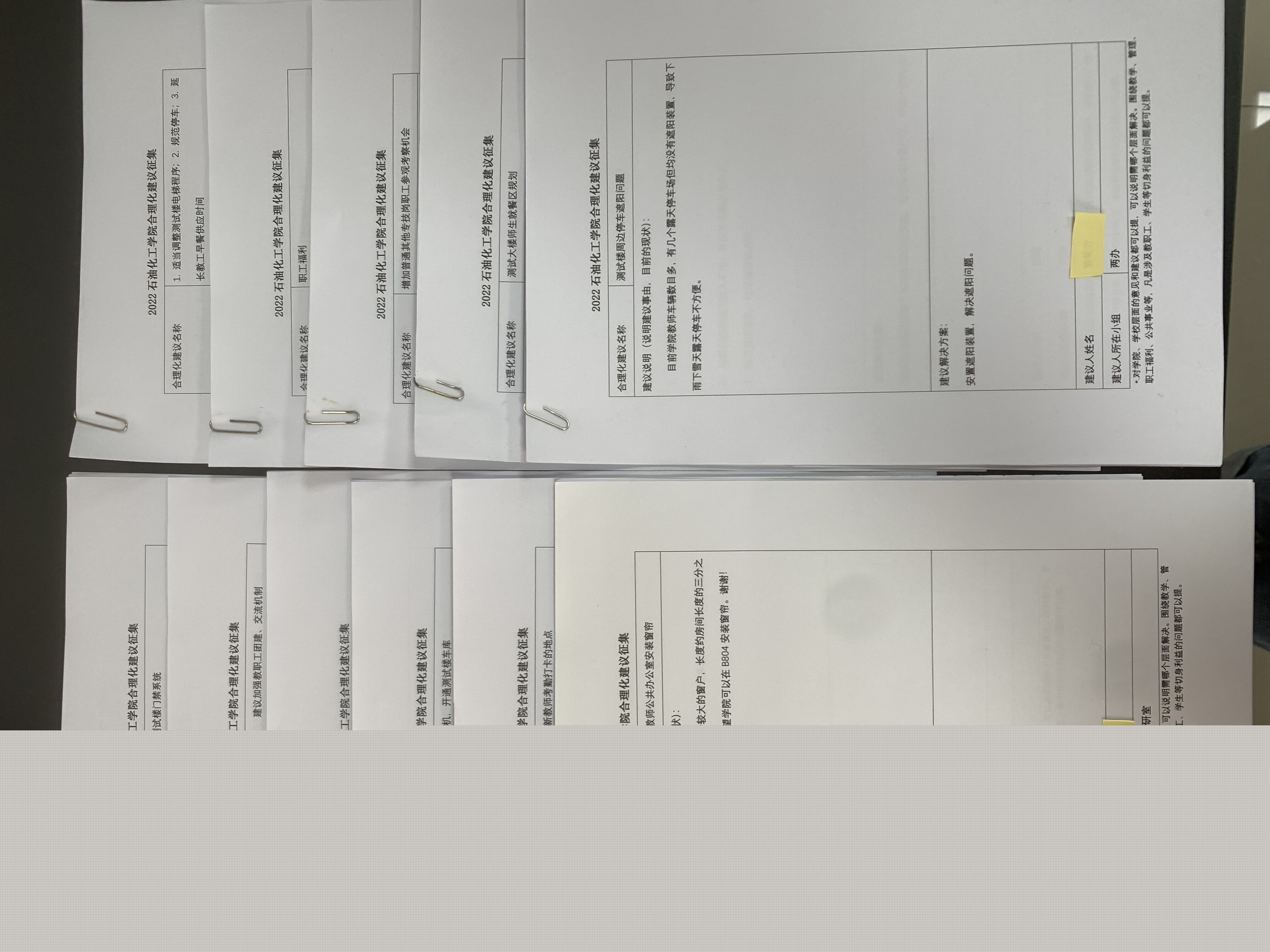 此次征集活動(dòng)共收集“合理化建議”58份,收集到的意見(jiàn)有93條。問(wèn)題主要集中在科教城東區(qū)停車(chē)難、用餐難、充電樁不足、安全、教學(xué)、專(zhuān)業(yè)技能提升、福利等11個(gè)方面的55條問(wèn)題,學(xué)院能解決的問(wèn)題已交由學(xué)院處理,學(xué)院范圍內(nèi)不能解決的問(wèn)題分工會(huì)將進(jìn)一步提煉成校級(jí)教代會(huì)提案上報(bào)給學(xué)校。
