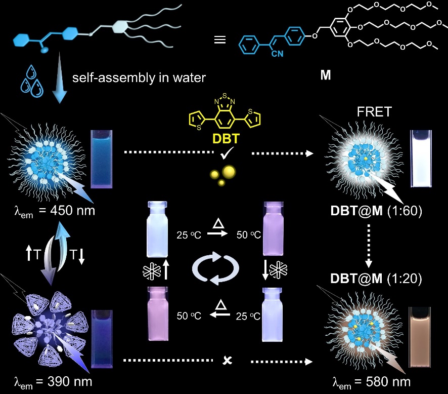 在前期的研究中,課題組開(kāi)發(fā)了若干人工超分子光捕獲系統(tǒng)(J. Mater. Chem. A2022, 10, 8528-8534. Chem. Commun., 2022, 58, 2343-2346.)和溫度響應(yīng)有機(jī)熒光材料(Chem. –Eur. J.2023, 29, e202203463. Chin. Chem. Lett., 2023, 34, 108617.)。在這些工作究的基礎(chǔ)上,同時(shí)基于自然界光合作用受溫度影響的啟發(fā),課題組近期在水相中又構(gòu)筑了一種具有可調(diào)白光發(fā)射的溫度響應(yīng)型人工光捕獲系統(tǒng),相關(guān)工作以“A temperature-responsive artificial light-harvesting system in water with tunable white-light emission”為題發(fā)表在國(guó)際材料化學(xué)權(quán)威雜志Journal of Materials Chemistry A上(J. Mater. Chem. A, 2023, 11, 18419-18425. IF: 11.9)。