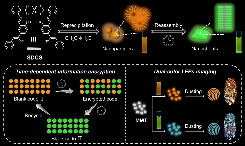 具有隨時(shí)間變化發(fā)光顏色的有機(jī)發(fā)光材料在化學(xué)傳感、高分辨率生物成像和高安全性信息加密等領(lǐng)域顯示出廣闊的應(yīng)用前景?;诖?,研究組開(kāi)發(fā)了一種橋連的氰基苯乙烯衍生物SDCS作為CH3CN/H2O混合溶劑中的單一組分的時(shí)間依賴(lài)熒光系統(tǒng)。具體來(lái)說(shuō),通過(guò)再沉淀法從SDCS制備的原始橙色發(fā)光納米顆??梢栽诔肿幼越M裝的驅(qū)動(dòng)下隨著時(shí)間的推移轉(zhuǎn)變?yōu)榫G色發(fā)光納米片。值得注意的是,這種轉(zhuǎn)化速率可以通過(guò)調(diào)整含水量來(lái)控制。基于這些獨(dú)特的屬性,時(shí)變熒光二進(jìn)制碼被開(kāi)發(fā)出來(lái),從而實(shí)現(xiàn)了具有更高安全性的時(shí)間依賴(lài)信息加密。此外,SDCS的雙色發(fā)光可以通過(guò)固體基質(zhì)來(lái)獨(dú)立固定,如被固定在水凝膠或粉末中。其中被固定在蒙脫土中所得的發(fā)光粉末成功地用于潛指紋的雙色熒光成像。這項(xiàng)工作展示了利用超分子策略控制單組分系統(tǒng)中的多重發(fā)射性質(zhì)并賦予其多功能應(yīng)用。相關(guān)工作以“Dynamic Time-Dependent Emission in Solution and Stable Dual Emission in Solid Matrix Exhibited by a Single-Component Fluorescence System”為題發(fā)表在國(guó)際材料科學(xué)權(quán)威雜志Advanced Functional Materials上(Adv. Funct. Mater.2024, doi: 10.1002/adfm.202314093. IF: 19.0)。