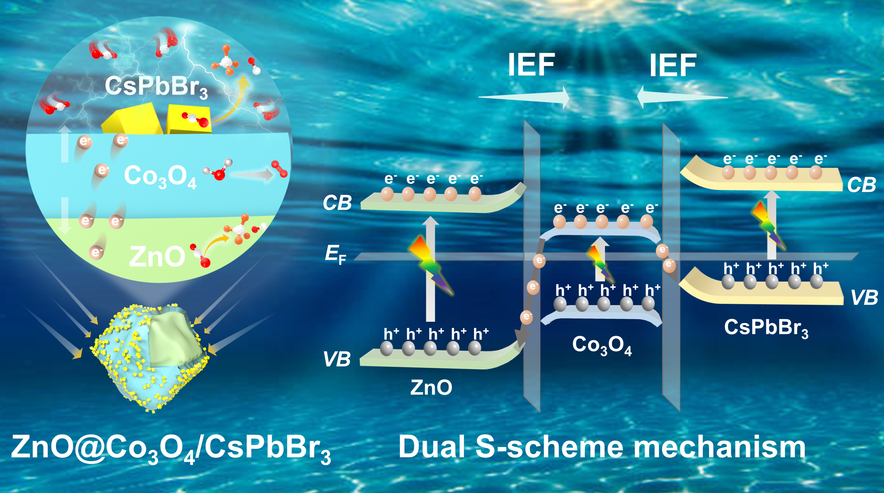在前期工作基礎(chǔ)上(J. Mater. Chem. A, 2022, 10, 24519-24528;Chem. Eng. J. 2023, 475, 146385),同時(shí)通過合理設(shè)計(jì)具有強(qiáng)內(nèi)建電場和高氧化還原能力的S型異質(zhì)結(jié)的啟發(fā),課題組制備MOFs衍生的ZnO@Co3O4/CsPbBr3多殼層催化劑在不使用犧牲劑和光敏劑的情況下,最佳光催化劑CH4產(chǎn)率為238.8 μmol g-1 h-1,選擇性高達(dá)90.9%。相關(guān)工作以:“Internal electric field-modulated dual S-scheme ZnO@Co3O4/CsPbBr3 nanocages for highly active and selective photocatalytic CO2 reduction”為題發(fā)表在Journal of Catalysis上 (J. Catal. 2024, 435, 115574, doi:10.1016/j.jcat.2024.115574)