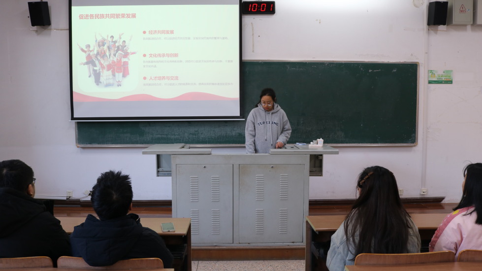 為了促進(jìn)各民族的團(tuán)結(jié)友愛、構(gòu)建和諧美好的民族大家庭,我院于12月29日在W1202教室開展了主題為“民族團(tuán)結(jié)一家親,同心共筑中國夢”的宣講活動。宣講會上,謝露深入淺出地圍繞民族團(tuán)結(jié)的關(guān)鍵意義、中國夢的豐富內(nèi)涵與意義、民族團(tuán)結(jié)與中國夢之間的緊密聯(lián)系以及青少年踐行方式四個核心維度,帶領(lǐng)大家深入解讀中國夢和民族團(tuán)結(jié)的關(guān)系。朱一飛與各位同學(xué)交流了各民族風(fēng)俗,宣傳了宗教與教育相分離原則。通過本次宣講活動,同學(xué)們對民族團(tuán)結(jié)和中國夢有了更深的理解和感悟,同時也激發(fā)了他們的責(zé)任感與使命感。