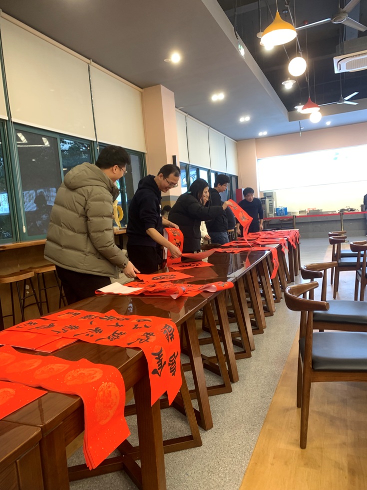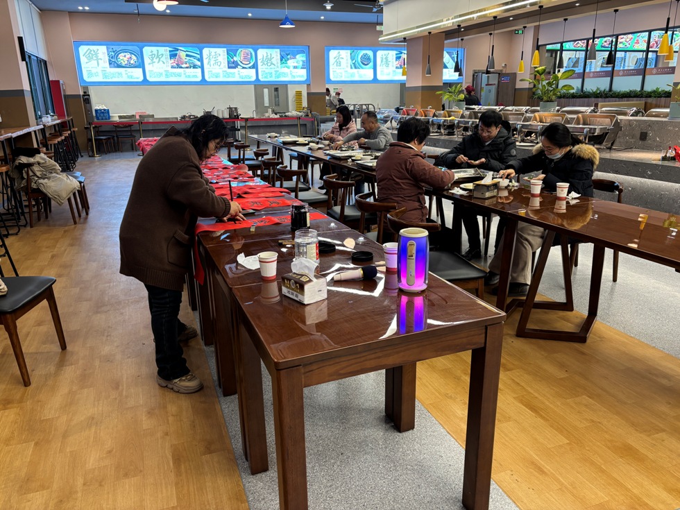 活動(dòng)現(xiàn)場,董燕敏老師為在場教職工現(xiàn)場寫春聯(lián)、送“?!弊郑环鶟鉂饽晡兜南矐c“春聯(lián)”和“?!弊郑€未晾干,就被熱情的職工們“一搶而空”。