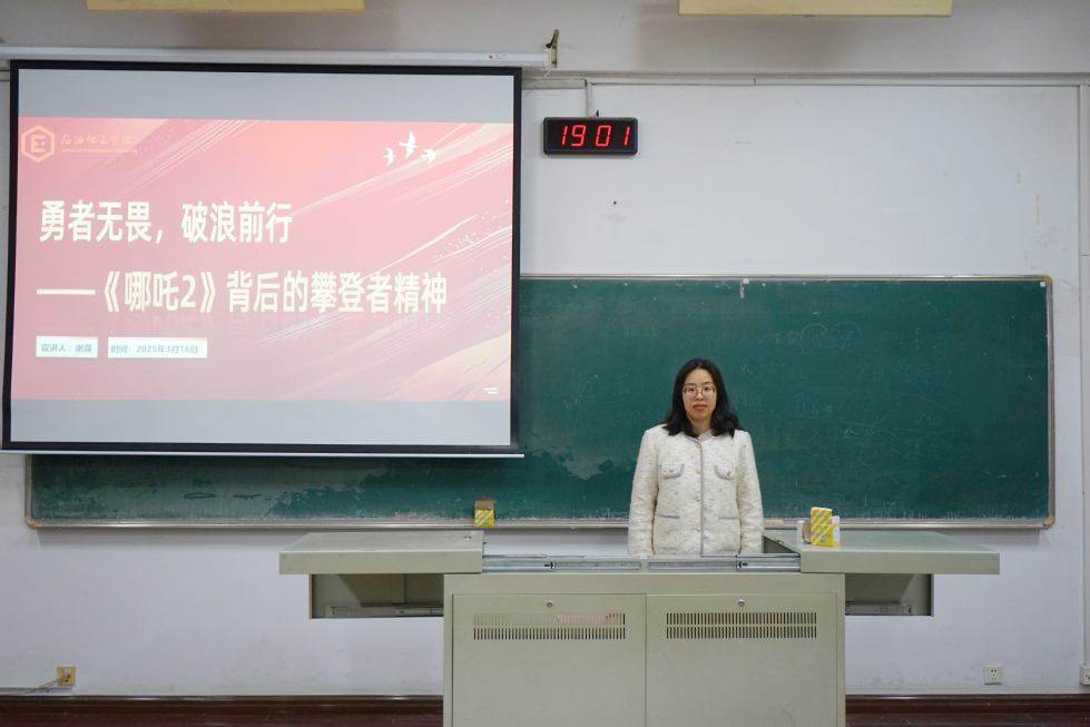講座上,楊帆以《哪吒2》突破百億票房為切入角,指出《哪吒2》的大火啟示我們應(yīng)積極培養(yǎng)創(chuàng)新意識,勇于實(shí)踐,將創(chuàng)新精神融入學(xué)習(xí)和生活的方方面面,為個(gè)人和社會創(chuàng)造更大的價(jià)值。接著謝露向同學(xué)們引出《哪吒2》背后的攀登者精神——刻苦鉆研、技術(shù)革新、團(tuán)隊(duì)精神以及文化傳承。她指出作為大學(xué)生要堅(jiān)守信念,培養(yǎng)鉆研探索的精神。