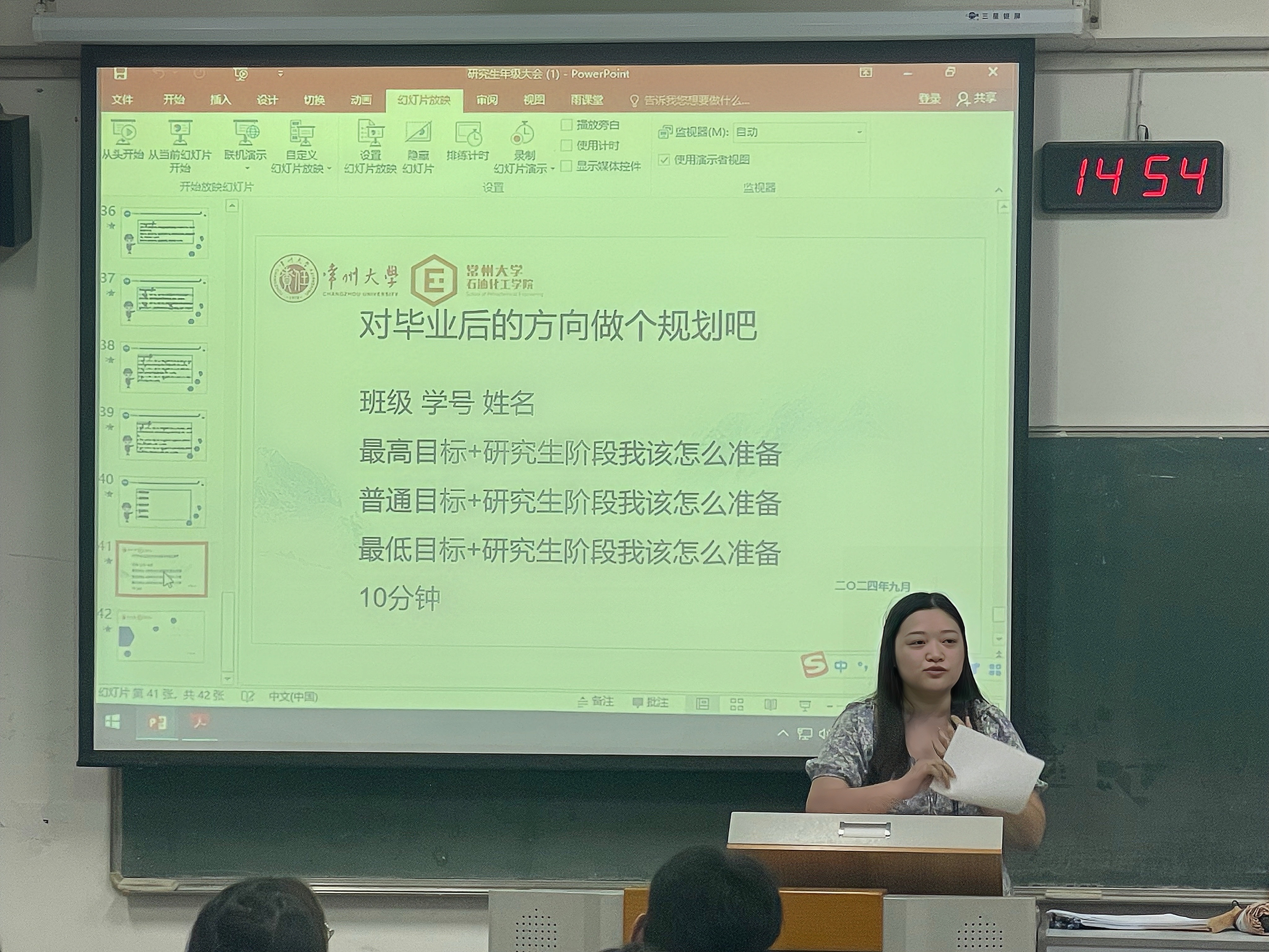 會(huì)上,趙彩霞、劉爽簡(jiǎn)要介紹了自身工作內(nèi)容,并圍繞 “常州城市文化”、“常州大學(xué)校史”、“學(xué)院部門及其職能”、“學(xué)習(xí)科研與職業(yè)規(guī)劃”、“規(guī)章制度與評(píng)獎(jiǎng)評(píng)優(yōu)”、“安全教育”六大核心板塊進(jìn)行講解。隨后,研究生輔導(dǎo)員吳林就研究生綜合素質(zhì)評(píng)價(jià)與獎(jiǎng)助學(xué)金評(píng)定的相關(guān)政策辦法進(jìn)行了詳細(xì)解讀,幫助同學(xué)們明晰了未來努力的方向。接下來,學(xué)院研究生會(huì)主席呂燁松對(duì)研會(huì)各部門職能作了系統(tǒng)介紹,并鼓勵(lì)研究生新生踴躍報(bào)名加入,在實(shí)踐中鍛煉自我、服務(wù)同學(xué)、貢獻(xiàn)力量。最后,趙彩霞、劉爽分別對(duì)大會(huì)內(nèi)容進(jìn)行總結(jié),希望同學(xué)們盡快適應(yīng)新環(huán)境、新身份,科學(xué)規(guī)劃研究生生活,積極參與學(xué)術(shù)研究與校園活動(dòng),全面提升綜合素養(yǎng)。