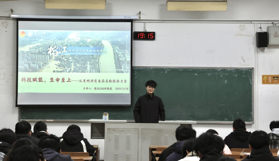 為幫助同學(xué)們更直觀地了解科技如何重塑應(yīng)急救援體系、守護(hù)生命安全,11月18日晚,學(xué)生第二黨支部黨員能化233班許偉晨在W1205教室開展了“青年講師團(tuán)”系列講座的第三講——“貴州洪災(zāi),見證科技力量”。