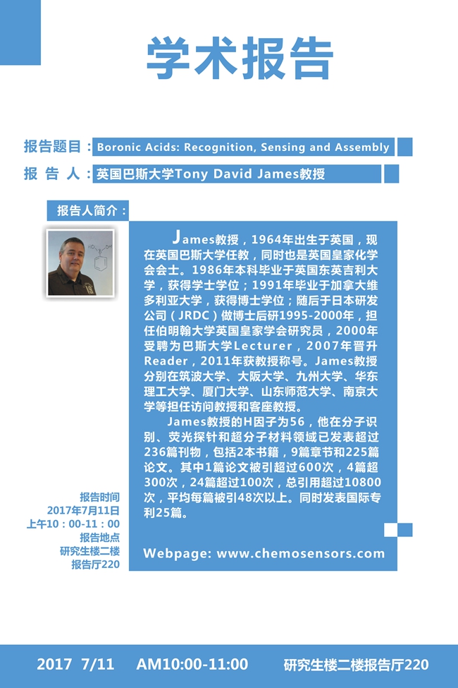 | 【學術】7月11日學術報告 —Boronic Acids:Recognition,Sensing and Assembly |