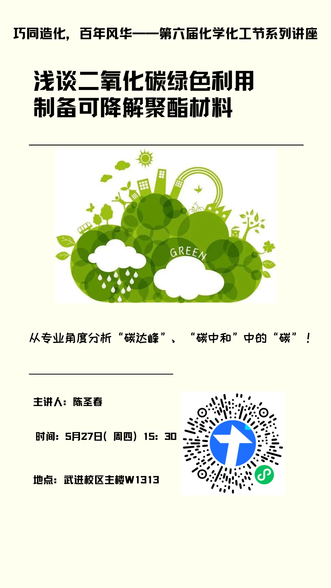 | 【講座】5月27日科普講座《淺談二氧化碳綠色利用制備可降解聚酯材料》---陳圣春 |