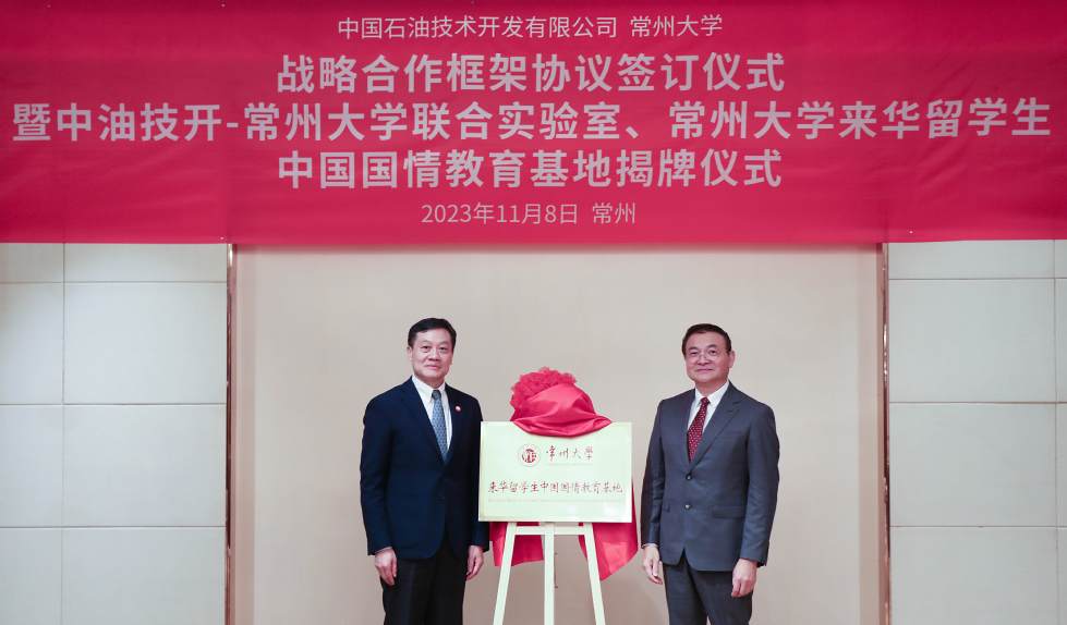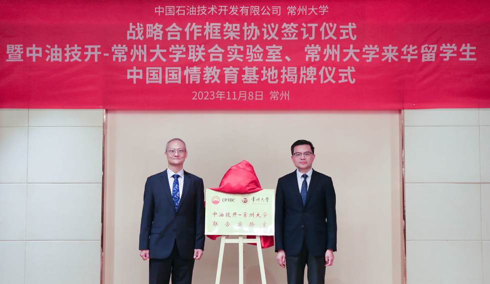 | 中國石油技術開發(fā)有限公司與常州大學戰(zhàn)略合作框架協(xié)議簽訂儀式暨中油技開-常州大學聯(lián)合實驗室、常州大學來華留學生中國國情教育基地揭牌儀式在常州舉行 |