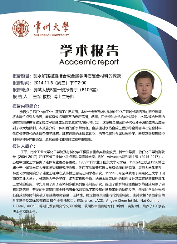 | 【學(xué)術(shù)報告】11月6日學(xué)術(shù)報告—王軍教授、周瑜教授 南京工業(yè)大學(xué) |