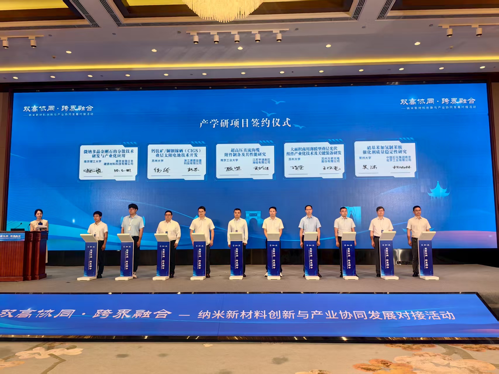 蘇州納米科技協(xié)同創(chuàng)新中心與全國高校先進(jìn)材料區(qū)域技術(shù)轉(zhuǎn)移轉(zhuǎn)化中心(江蘇)簽署合作協(xié)議,中國藥科大學(xué)等6所高校協(xié)同創(chuàng)新中心與全國高校生物醫(yī)藥區(qū)域技術(shù)轉(zhuǎn)移轉(zhuǎn)化中心(江蘇蘇州)達(dá)成共建共識,10個(gè)校企合作項(xiàng)目同步簽約,其中我校光伏科學(xué)與工程協(xié)同創(chuàng)新中心、先進(jìn)催化與綠色制造協(xié)同創(chuàng)新中心分別與江蘇晶盛旺新材料科技有限公司、中石化南京化工研究院有限公司簽約合作項(xiàng)目。常州大學(xué)等江蘇高校納米新材料領(lǐng)域多項(xiàng)重大科技成果同步發(fā)布,涵蓋光伏、生物醫(yī)藥、環(huán)境治理、半導(dǎo)體材料等關(guān)鍵領(lǐng)域。